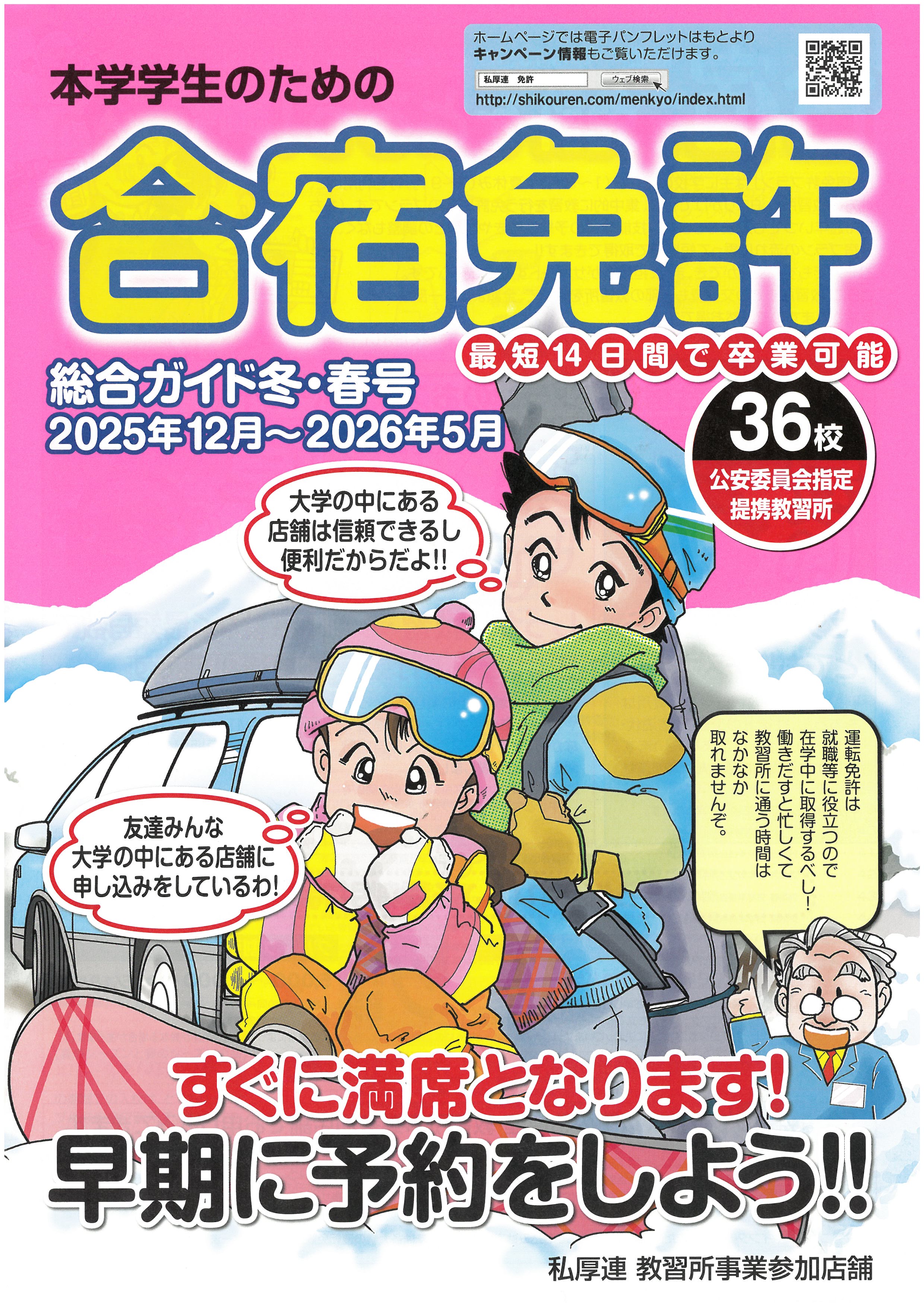 提携教習所 | 通学67校、合宿34校 パンフレットは購買センター、もしくは上記デジタルパンフレットをご覧ください。 |