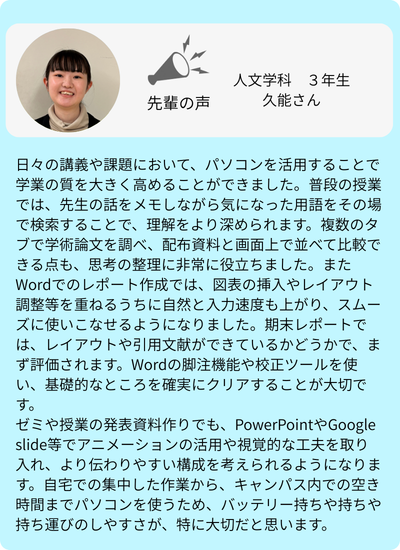 また、本学ではBYOD(自分専用PCの持参)が推奨されており、授業や自主学習で自分のパソコンを使うのが一般的です。